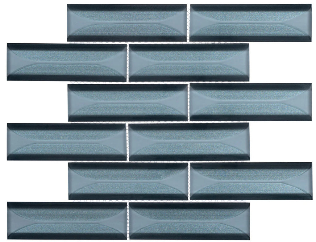 The Valley Tram design showcases a captivating blend of shimmering metallic tones and soft frosted glass accents. Each back-beveled glass piece adds dimensional appeal, making it perfect for kitchen backsplashes, bathroom walls, and accent installations. Its subtle metallic sheen and sleek layout bring a touch of sophistication and modern luxury to your design.
