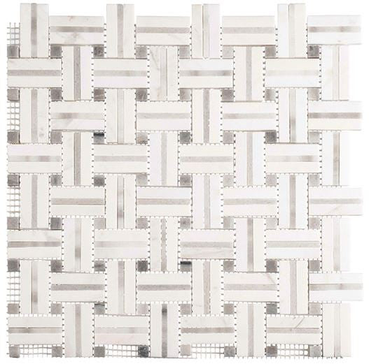 Create a sophisticated focal point with the Ultra Weave Collection Nubian Tapestry marble mosaic tile. This elegant design combines bright white marble with refined Carrara gray marble inserts, forming a woven pattern that adds texture, movement, and timeless appeal. The subtle contrast delivers a balanced, high-end look that works beautifully in both modern and transitional interiors.