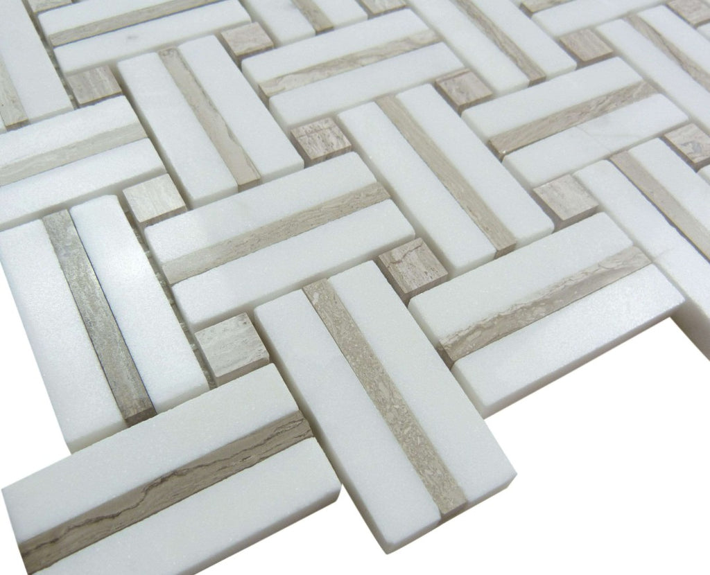 The My Tile Backsplash Ultra Weave Series UTW-471 Kalahari Dunes delivers an elegant blend of natural textures and modern design. Featuring a refined mix of white stone paired with soft wood-gray accents, this 1" x 2" natural stone mosaic creates a warm, woven appearance that adds depth and sophistication to interior spaces.