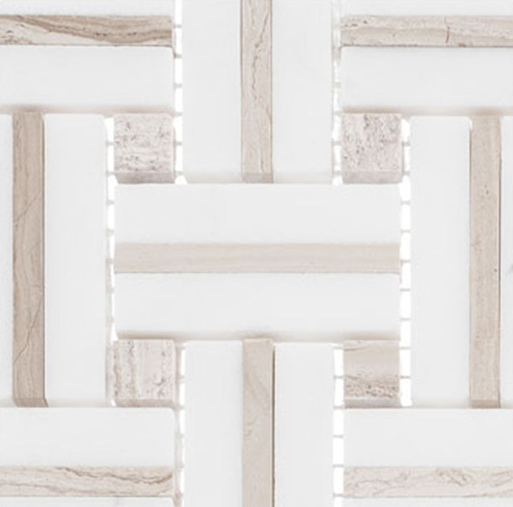 The Ultra Weave pattern introduces subtle contrast and natural movement through its interlaced layout. The combination of light stone and wood-inspired gray tones makes this mosaic a versatile choice for both contemporary and transitional interiors. Its dimensional surface enhances visual interest while maintaining a clean, upscale aesthetic.